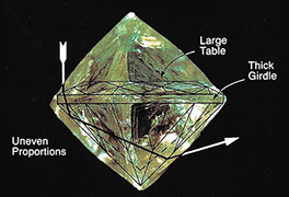 Most diamonds are “spread” in their cutting to retain maximum weight from the original rough. A heavier diamond will result, but at a dramatic sacrifice of potential fire and brilliance.